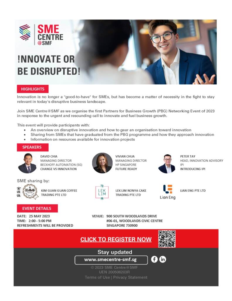 Join SME Centre@SMF as we organise the first Partners for Business Growth (PBG) Networking Event of 2023 in response to the urgent and resounding call to innovate and fuel business growth.